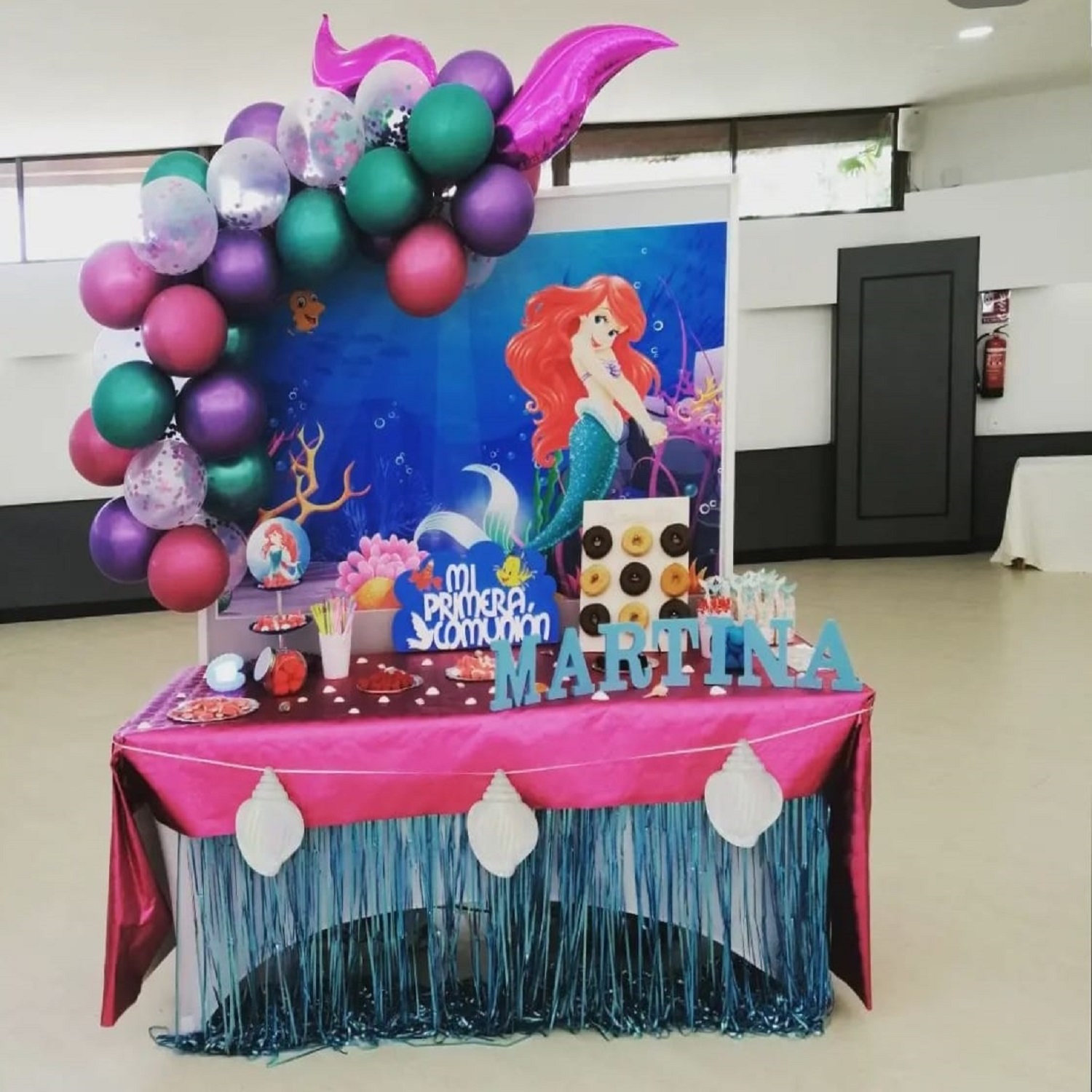 Nos encargamos de la decoración de las mesas de una forma totalmente personalizada añadiendo tantos detalles como vosotros queráis, como por ejemplo globos, letras con su nombre, banderitas con la temática a elegir…